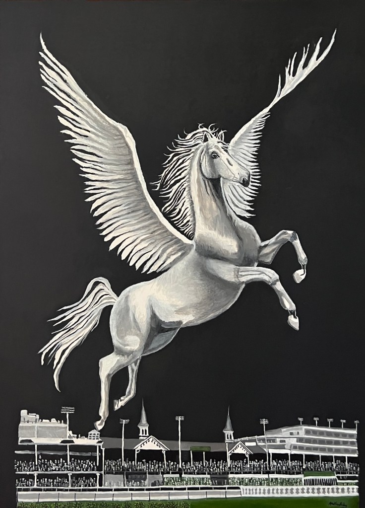 Racing Rules in Kentucky! This painting is a 30” x 40” x 1.75” Oil on Gallery-wrap canvas. Pegasus was from Greek mythology and a powerful winged white horse. His father was Poseidon and his main is designed after his mother, the snake haired gorgon,Medusa. Zeus honored him with a special immortality turning Pegasus into a constellation in the northern sky. This can be seen and acquired at Kore Art Gallery. (502) 333-4355.
