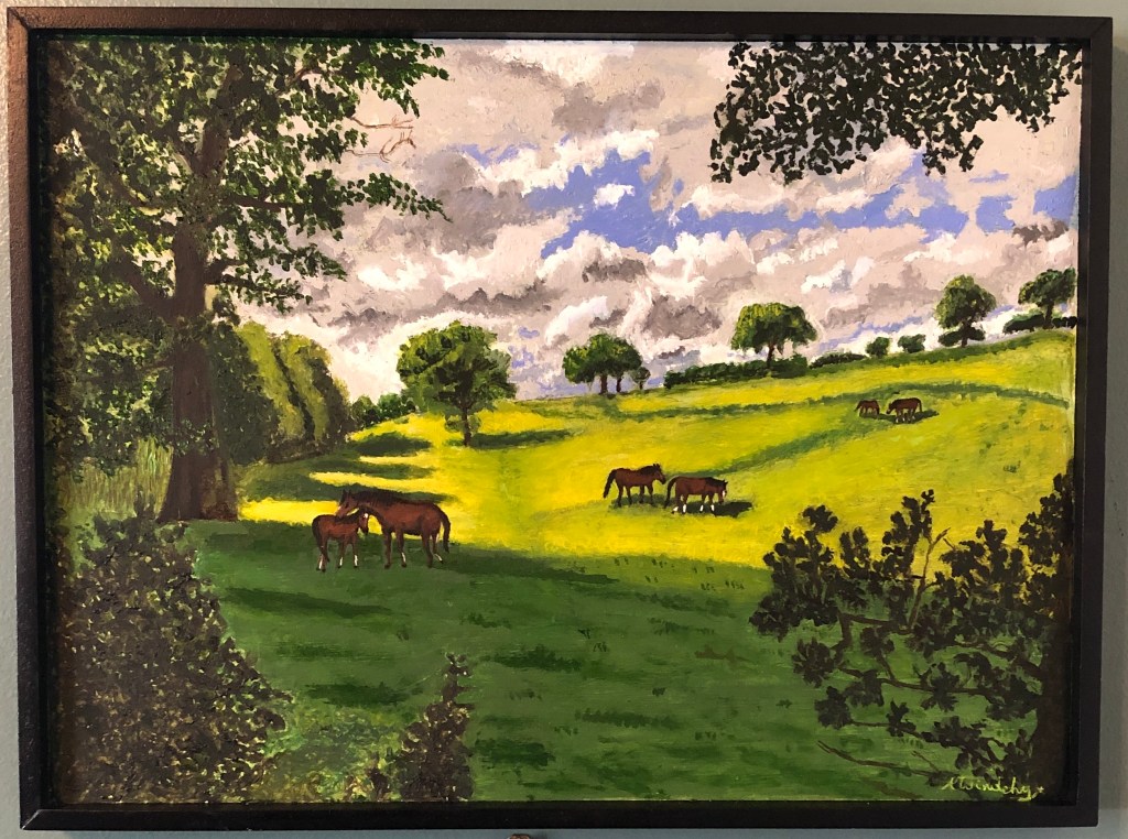 Field of Horses is an oil on framed composite board. The painting itself is 11 ⅛” x 15 ⅛”. It can not be separated from the frame that measures 12” x 16”. It is a scene of a beautiful field in which I placed horses. I do not usually do landscapes but wanted to do something different. 02/2021.