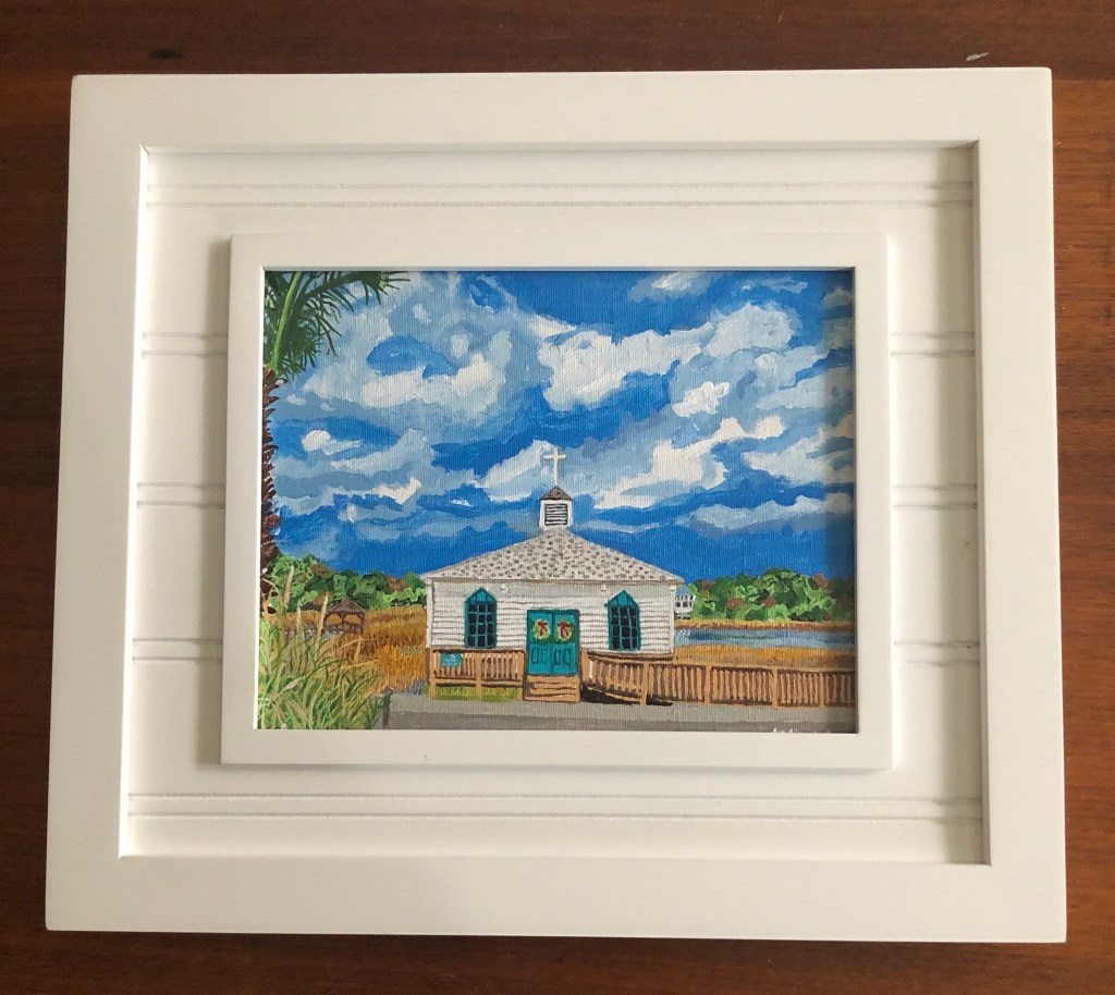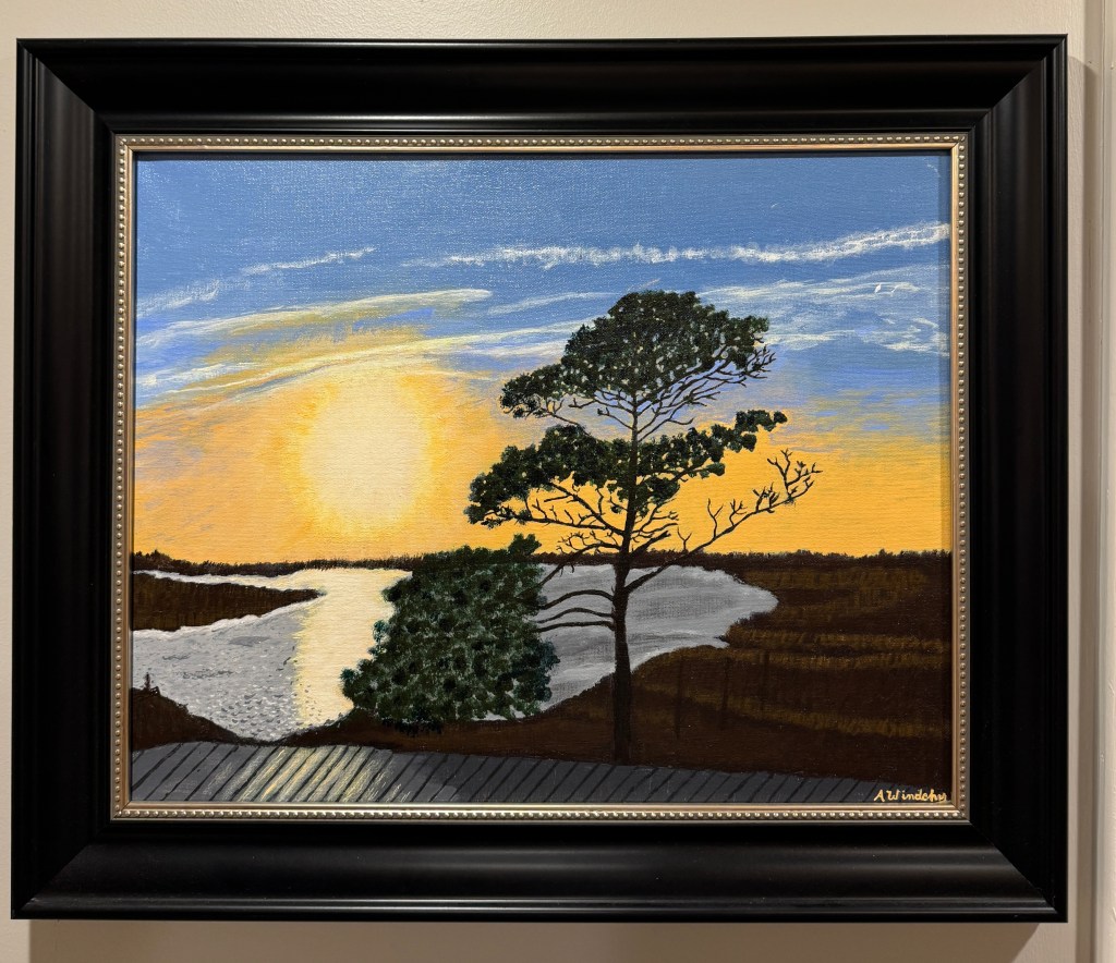 South Carolina Sunset is an Oil on a 16”H x 20”W canvas mounted in a frame that is 20.5”H and 24.5”W. This is the view from a Seafood restaurant that was not nearly as serene. At Kore Gallery.