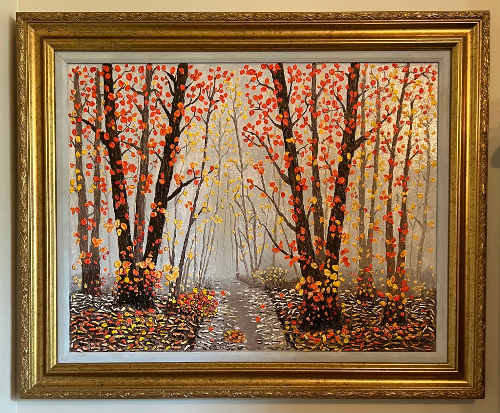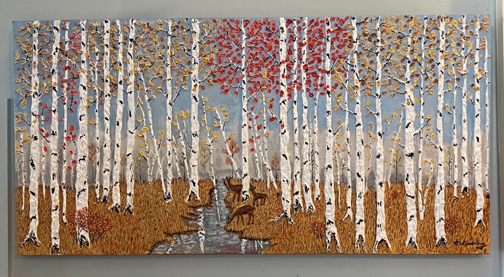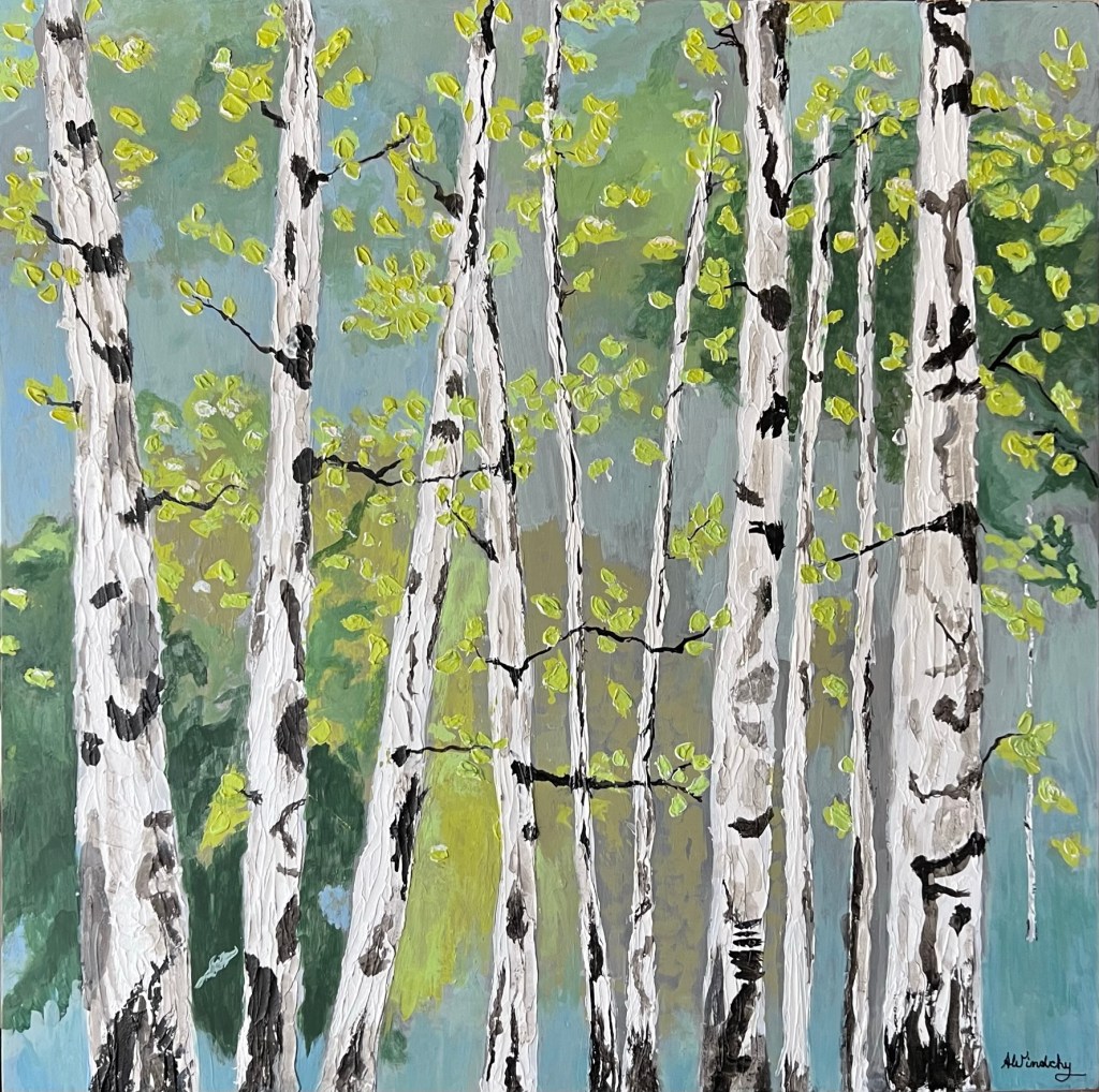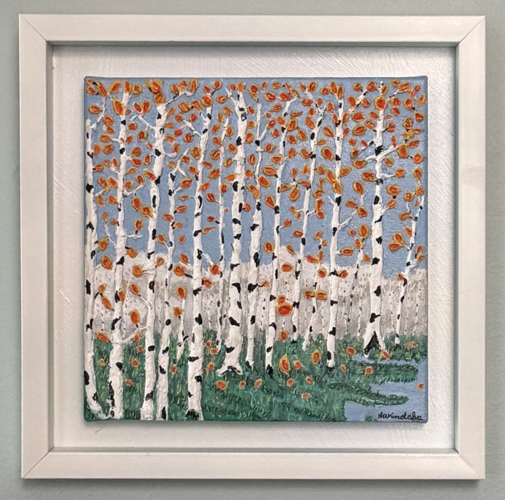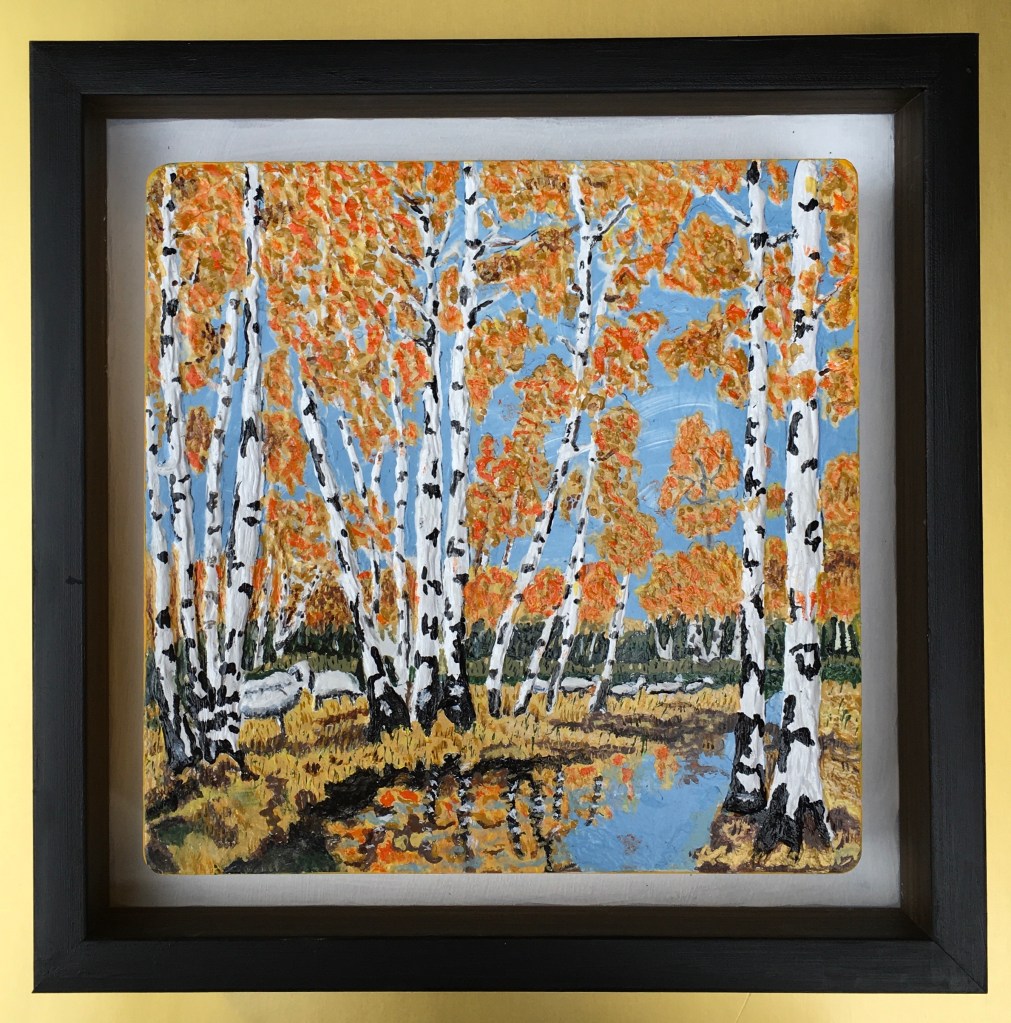 Birch Dance. Created with acrylic paste to produce the 3 dimensional effect of the trees and leaves. Painted with acrylic paint. It is an 8×8” canvas that framed measures 10.5”x10.5”. Enjoy the beauty of the stream where birch leaves dance. Visit Kore Gallery