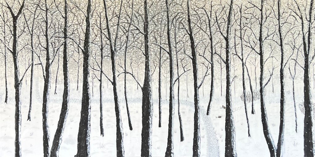 Deer Crossing is created using acrylic resin paste on a 12” x 24” wood panel to create a three dimensional image. It is then painted with acrylic paint. Sold!