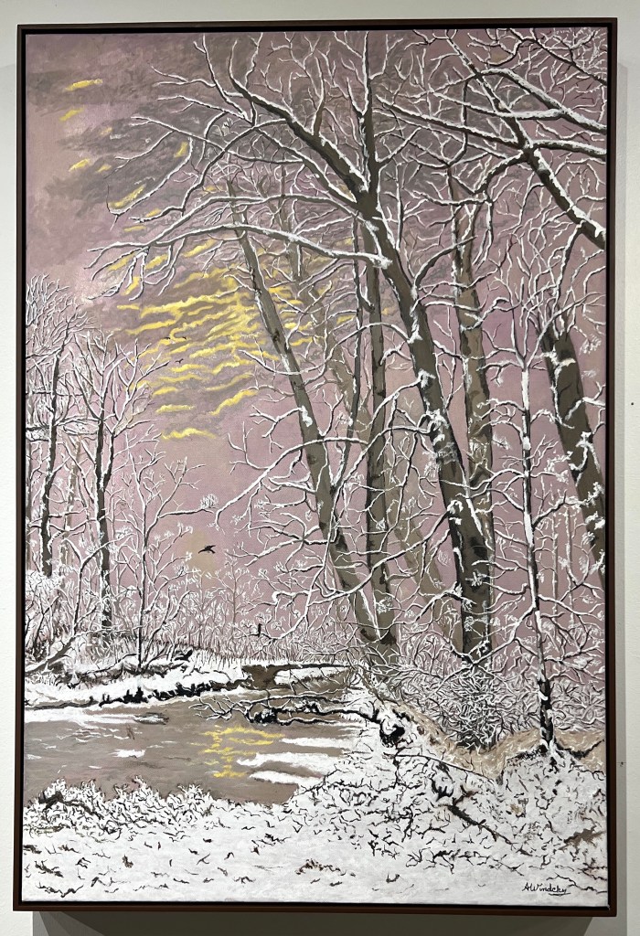 Sunrise at Cherokee Park. is a 24”x 36” x 1.5”oil on canvas. It is framed in a dark wood frame. It is shown at Kore Art Gallery.