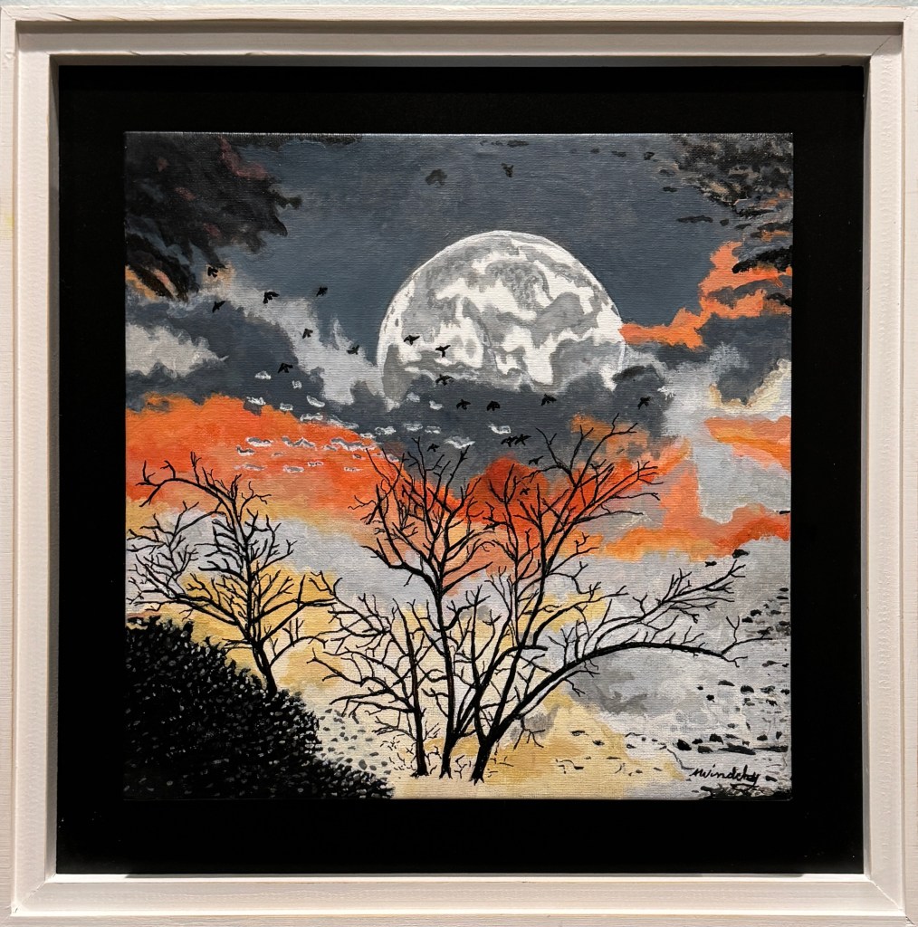 Moonrise at Sunset is an acrylic on 12”x12” Canvas on board. It is mounted on a frame that is 16.5” x 16.5”.