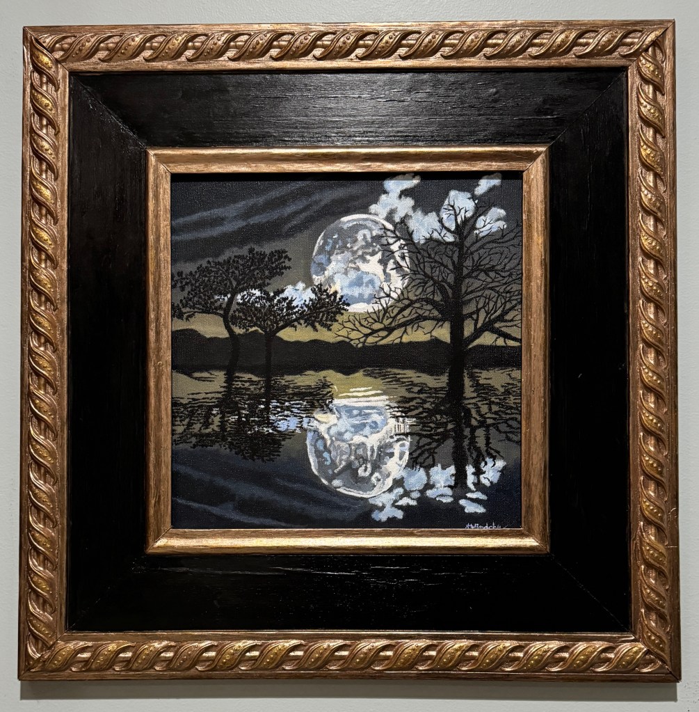Moon Over the Lake on a Cloudy Night is an oil on 12”x12” canvas covering gypsum board cut to fit this Old frame. Framed it measures 21.5” x 21.5 “. See Kore Art Gallery to view.