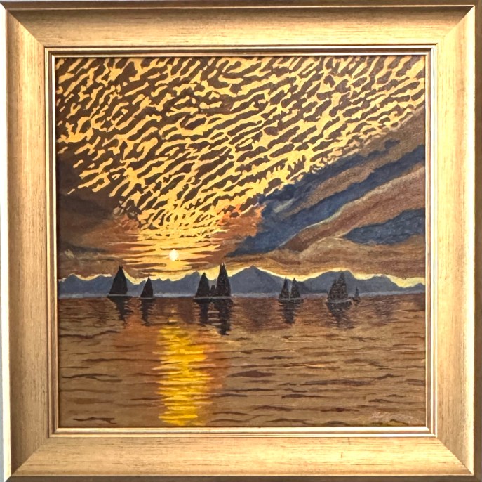 Sailing at Sunset is a landscape that is painted in Acrylic on a 12″ x 12″ canvas. Framed in Gold wood, it measures 15″ x 15″ x 1″. I painted a photo as an abstract . Price: $185